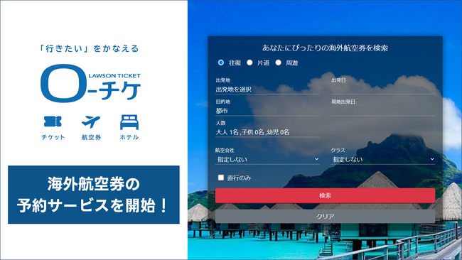 株式会社ローソンエンタテインメント(本社:東京都品川区、代表取締役社長:野口 透)は、航空券・ホテル・ツアーなどの予約を行う『ローチケ[旅行]』において、海外航空券予約サービスを開始いたしました。