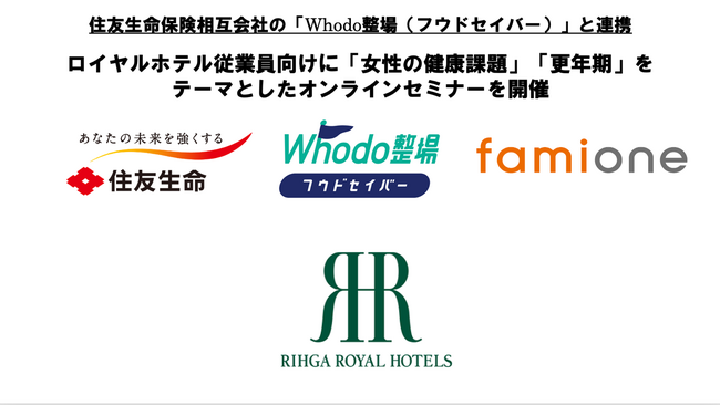 「子どもを願うすべての人によりそい 幸せな人生を歩める社会をつくる」をビジョンに掲げ、法人の従業員向け福利厚生や自治体の住民向け支援を行うヘルスケアサポートサービス「ファミワン」 https://famione.com/benefit/ などを展開する株式会社ファミワン(本社:東京都渋谷区、代表取締役:石川勇介)は、住友生命保険相互会社(本社:大阪府大阪市、取締役 代表執行役社長:高田 幸徳)の不妊治療と仕事の両立支援ソリューション「Whodo 整場(フウドセイバー)」を介し、株式会社ロイヤルホテル(本社:大阪府大阪市、代表取締役社長:植田 文一、以下ロイヤルホテル)の健康経営推進者向けに「女性の健康課題、男性の更年期」をテーマとしたオンラインセミナーを開催いたしました。