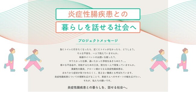 本プロジェクトの特設サイトでは、これまで潰瘍性大腸炎の患者さんの声をはじめ、患者さんへの「便意切迫感」に関する調査結果やWEB動画「便意切迫さんのうた」など、疾患と「便意切迫感」に関する社会の理解促進に向けた情報発信を行ってまいりました。新たに、クローン病を加えた炎症性腸疾患の情報と、「便意切迫感」に関する社会の理解促進に向けた情報の発信を行ってまいります。