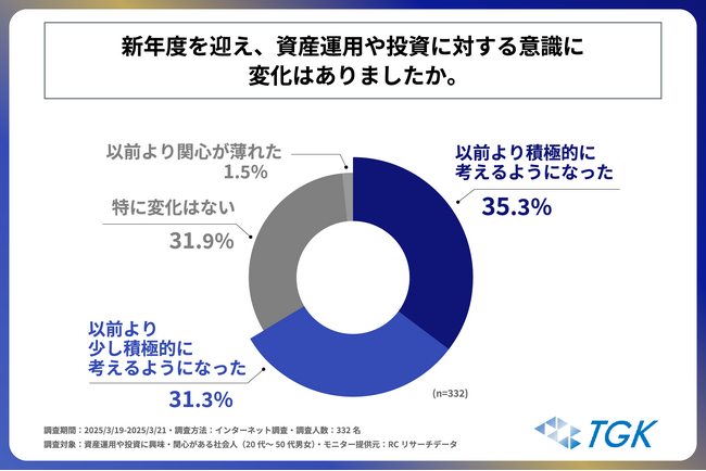 まず、「新年度を迎え、資産運用や投資に対する意識に変化はあったか」を問う設問への回答では、1位が「以前より積極的に考えるようになった」で35.3%、2位が「特に変化はない」で31.9%、3位が「以前より少し積極的に考えるようになった」で31.3%という結果になりました。1位と3位の回答を合計すると、回答率70%弱となり、この結果から約7割の人が新年度に入り、資産運用や投資に対して以前より積極的に考えるようになっていることが明らかになりました。