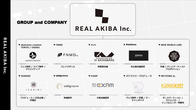 株式会社リアルアキバ は、“秋葉原”・”ダンス”・“音楽”、それらに付随するすべてのカルチャーを世界に発信していくことを目的とし、各社が築いてきた企画・クリエイティブ制作・ネットワークを結集し、エンターテインメントとテクノロジーを掛け合わせた新しい価値の創出を目指して設立されました。レペゼン秋葉原ことREAL AKIBA BOYZを筆頭に、人気沸騰中のO-MENZ、アニソンアーティスト「fhana」「岸田教団&THE明星ロケッツ」「DOES」、インフルエンサーにおいては、牛丼2000日を達成した「マナリス」、「ラブマツ」など多くの所属するタレントの力を結集し、日本のオタク・ダンス・アニメ・アニソンなどのコンテンツが世界中で愛される世界を創っていきます。