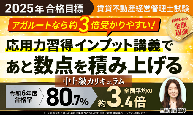 2025年合格目標 賃貸不動産経営管理士試験 中上級カリキュラムをお申込みいただいた方が2025年の賃貸不動産経営管理士試験に合格された場合、合格特典(全額返金 or お祝い金2万円)がございます。