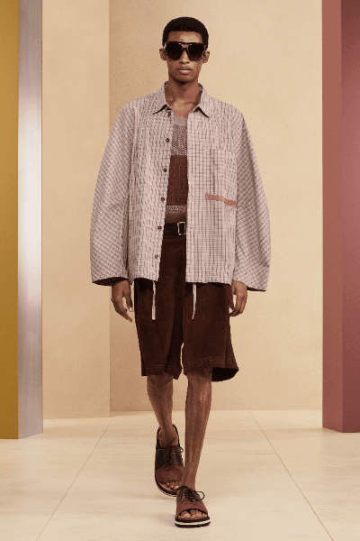 どのようにして固定概念を克服するのか?SRPLSが示す答えのひとつは、固定概念に挑むデザイン。新たなシルエットやプロポーション、素材使いを探求することで、クラシックの概念を刷新しようとしています。組み込まれたベルトや折り返しの留め具が特徴のトラウザーは、ウエストラインを高く設定することで、印象的なシルエットを生み出します。マリニエールトップ、オープンカラーシャツ、ギンガムチェックのシャツ、ラグビーシャツ、ニットポロ、トレンチコート、カーディガン、セーターなどの定番アイテムは、思いがけないプロポーションの変化や刺繍パッチワークといった繊細なディテールによって新たな解釈が加えられています。柔らかなベリーカラーはウィメンズとの調和を演出し、ソフトに仕立てたサマーグリップバッグやショルダーバッグに見られる特徴的な斜めポケットのディテールもその一環です。そして、モカシン(折りたたみ可能なかかと付き)、ガムソールスニーカー、ハイブリッドサンダルなど、多様に対応できるフットウェアが、自在なスタイルの基盤を提供します。SRPLSは、意志のある革新的なデザインによって、視線を惹きつけます。