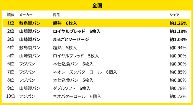 全国1位は「6枚切り食パン」、北海道は「菓子パン」が多数ランクイン!