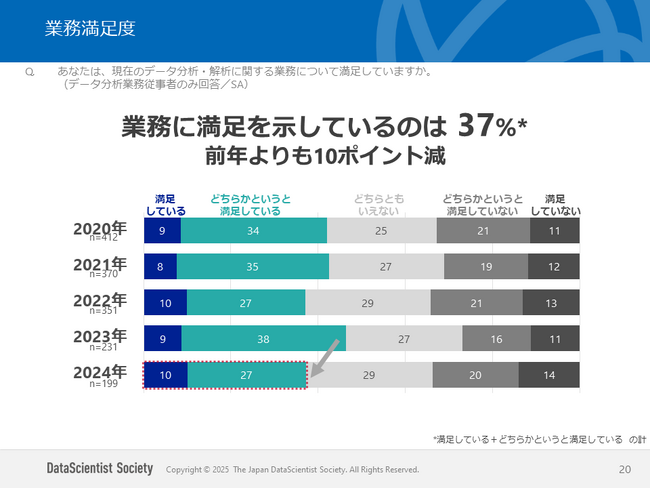 ・データサイエンス業務への満足度、またデータサイエンティストの将来性はいずれも昨年から低下傾向