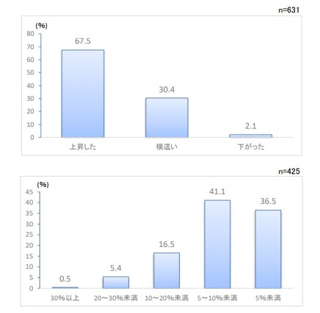 - 上昇続く従業員給与:「上昇した」6割超 上昇率 10%未満 7割超
