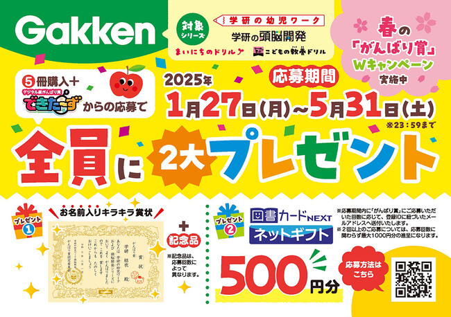株式会社 学研ホールディングス(東京・品川/代表取締役社長:宮原博昭)のグループ会社、株式会社 Gakken(東京・品川/代表取締役社長:南條達也、以下Gakken)は、2025年5月31日(土)まで、「Gakken 幼児ワーク 春の「がんばり賞」Wキャンペーン」を開催中です。