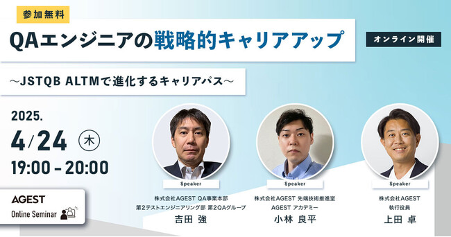 AGEST、【4月24日(木)開催 無料オンラインセミナー】『QAエンジニアの戦略的キャリアアップ~JSTQB ALTMで進化するキャリアパス~』開催のお知らせ