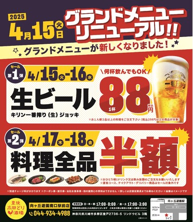 「白木屋」「魚民」「目利きの銀次」などを全国に展開する株式会社モンテローザ(本社:東京都杉並区、代表取締役:大神輝博)は、2025年4月15日(火)に豊後高田どり酒場 向ヶ丘遊園南口駅前店のグランドメニューをリニューアルします。