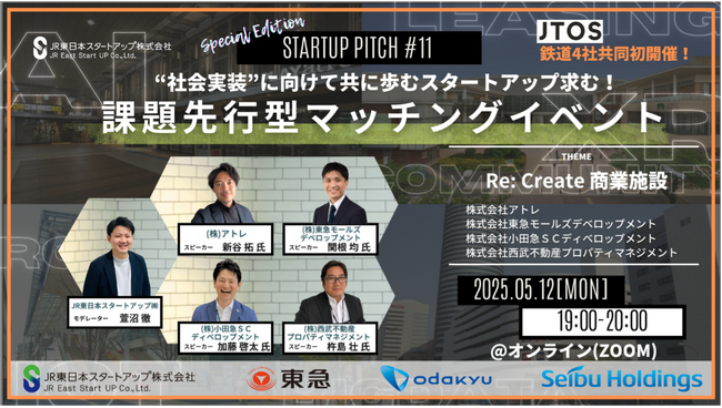 - JR東日本スタートアップ株式会社(代表取締役社長:柴田 裕、以下「JR東日本スタートアップ」)は、JR東日本グループの抱える課題を提示して、優れたアイデアや先端技術を持つスタートアップとのマッチングを推進するオンラインイベント「STARTUP PITCH」の第11回を開催することをお知らせします。なお、今回はJR東日本スタートアップ、東急株式会社、小田急電鉄株式会社、西武ホールディングス株式会社の鉄道4社で構成される鉄道横断型社会実装コンソーシアム「JTOS(ジェイトス)」との共同開催になります。鉄道会社4社合同での実施は日本初の取り組みです。