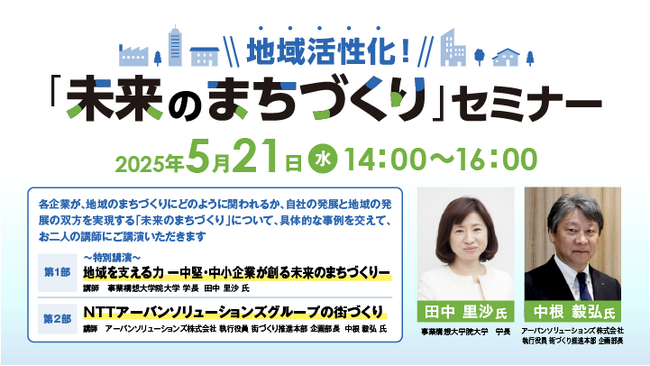 今回は、中堅中小企業を含む各企業が、地域のまちづくりにどのように関われるか、自社の発展と地域の発展の双方を実現する「未来のまちづくり」について、具体的な事例を交えて、お二人の講師にご講演いただきます。