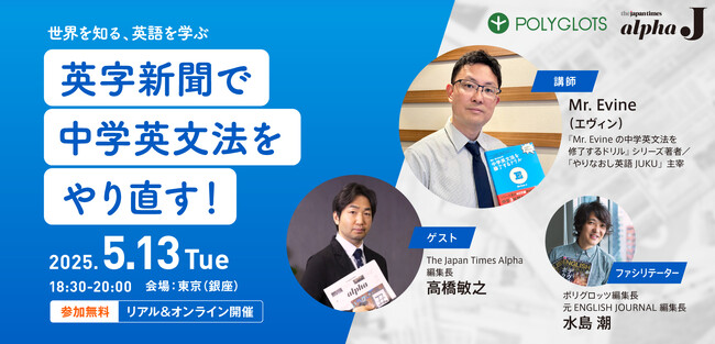 英語学習アプリ「レシピー」を提供している株式会社ポリグロッツ(本社:東京都新宿区、代表取締役:山口隼也)は、2025年5月13日(火)、英語学習者のための無料セミナー『英字新聞で中学英文法をやり直す!』を開催することをお知らせします。