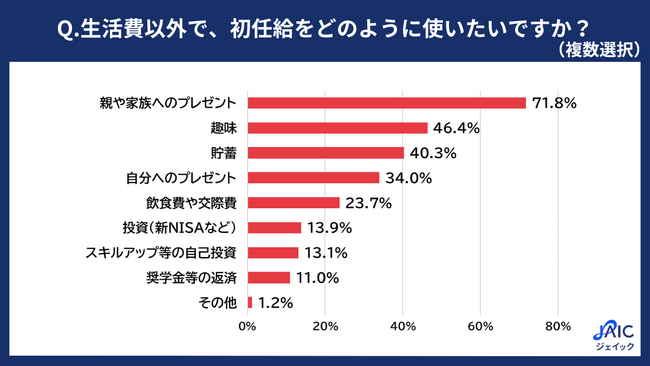 ■生活費以外の“初任給の使い方”:1位「親や家族へのプレゼント」(71.8%) 「生活費以外で、初任給をどのように使いたいですか?現時点であてはまるものをすべて選択してください」と質問したところ、「親や家族へのプレゼント」が71.8%、「趣味」が46.4%、「貯蓄」が40.3%、「自分へのプレゼント」が34.0%、「飲食費や交際費」が23.7%、「投資(新NISAなど)」が13.9%、「スキルアップ等の自己投資」が13.1%、「奨学金等の返済」が11.0%、「その他」が1.2%となりました。「その他」では、車のローンの支払い、家賃の支払い、借りたお金の返済といった回答が寄せられました。