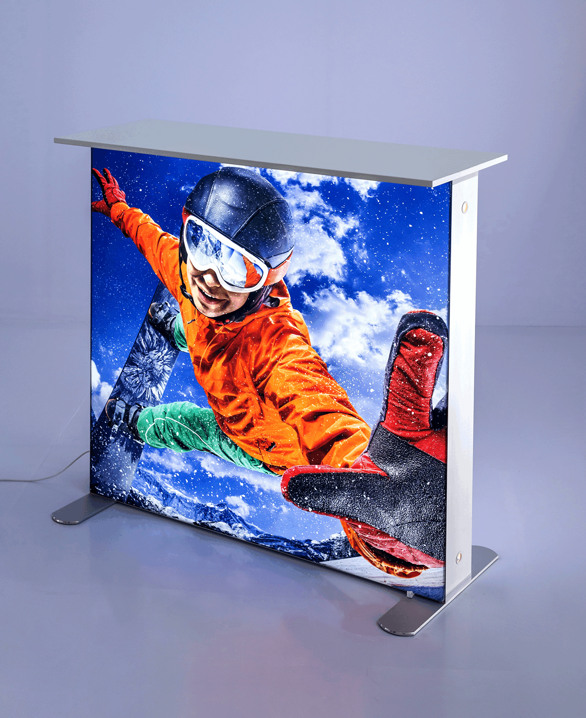 大型バックボードのケースには、天板も付いているのでカウンターテーブルとしても使用可能で、側面には印刷もできるので、目を引くオリジナルなカウンターも作成できます。