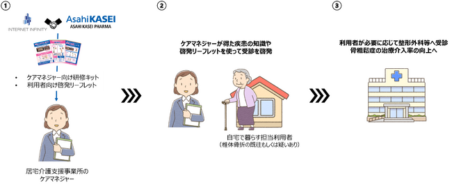 このような課題に対して、骨粗鬆症について深い知見を持つ旭化成ファーマと、介護事業者とのネットワークを持つインターネットインフィニティーの両社の強みを生かした、ケアマネジャーを介した骨粗鬆症の診断・治療を促す啓発活動を開始しました。