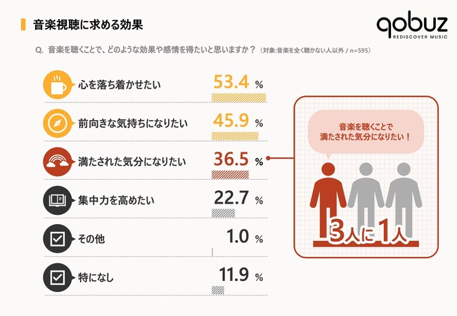- さらに36.5%の人は「音楽を聴くことで満たされた気分になりたい」と回答し、音楽を通じて自己を幸福にしたいと考えるニーズが明らかになった。