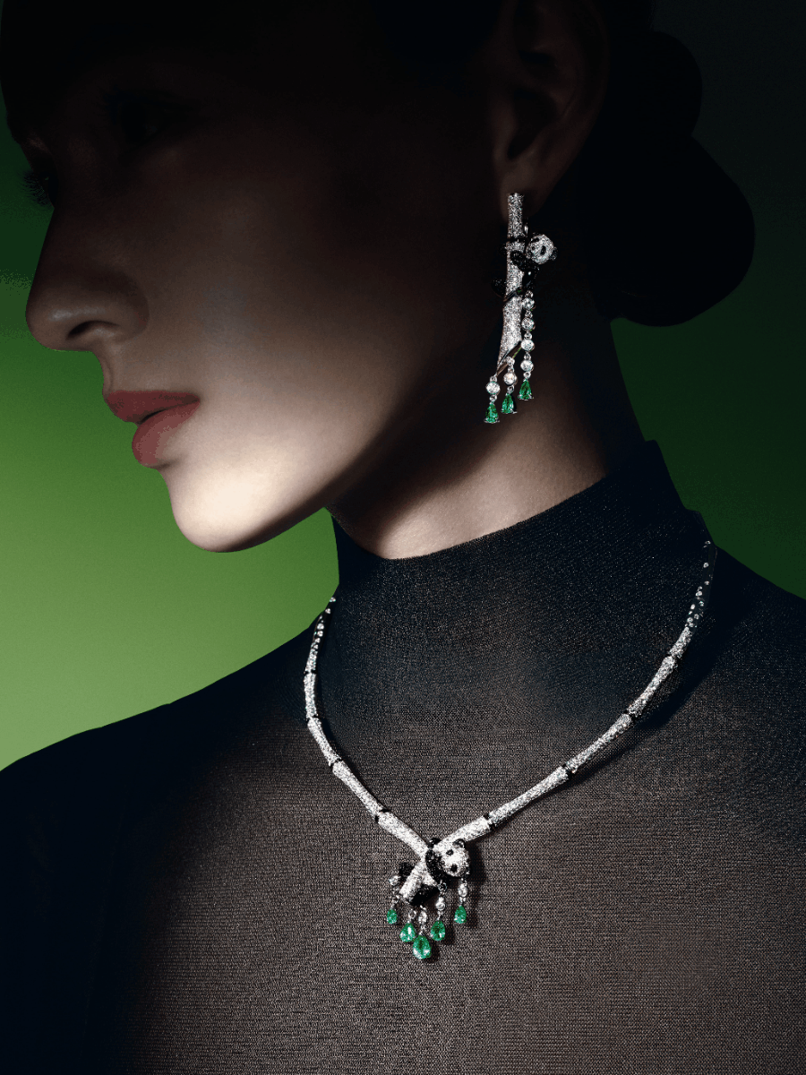“BAMBOO BO BO” は、Qeelinのアイコン的存在であるBo Boが竹とのコラボレーションで、新たな魅力を纏います。竹はパンダにとって大切な食糧であり、彼らが生きる環境そのもの。その特別なつながりを表現した “BAMBOO BO BO” は、18Kホワイトゴールドにダイヤモンドとエメラルドをあしらい、竹とパンダの絆を映し出します。 緻密なパヴェセッティングによって、竹の節の間にダイヤモンドを丁寧にあしらい、リアルな質感としなやかな動きを再現。鮮やかなエメラルドの葉がアクセントを加え、奥行きのあるエレガントな印象に仕上げています。竹の間でくつろぐBo Boの姿は、まるで自然の中の無邪気なひとときを切り取ったかのような愛らしさ。遊び心に満ちたデザインが、自然の調和と喜びを感じさせます。