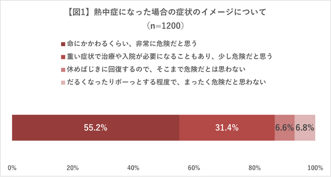 - 熱中症になった場合の症状のイメージについて、「危険だと思う」と回答したのは、全体の86.6%(1039人)に上った。反対に、「危険だと思わない」人は13.4%(161人)だった【図1】。