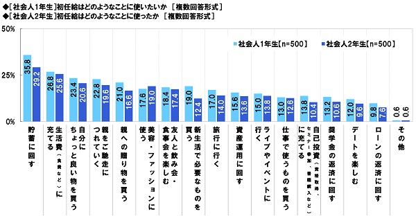 次に、社会人2年生(500名)に、初任給はどのようなことに使ったか聞いたところ、「貯蓄に回す」(29.2%)が最も高くなり、「生活費(食費など)に充てる」(25.6%)、「自分にちょっと良い物を買う」(20.6%)、「親をご馳走につれていく」(19.6%)、「美容・ファッションに使う」(19.0%)と続きました。