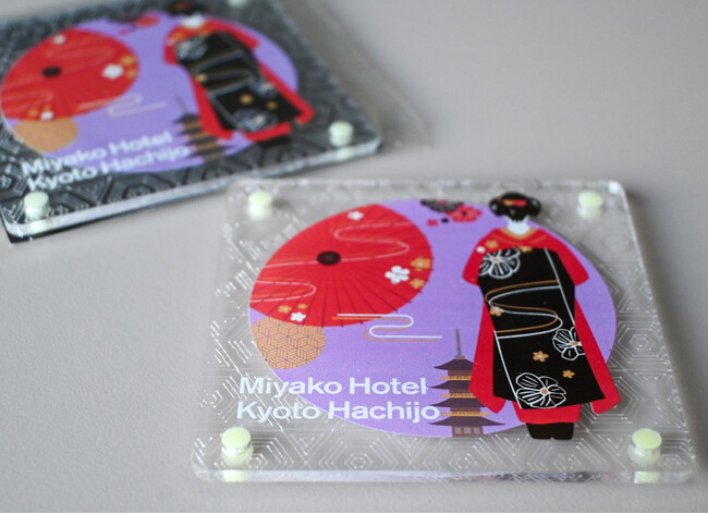 「アクリルグッズ等再生利用促進協議会」の協力で計画がスタート。予定していたリサイクル方法を見直すなどの紆余曲折を経て、CO2削減と品質維持を両立する「アップサイクル(洗浄・カット・研磨・加飾)」により、飛沫防止用アクリル板がホテルロゴ入りコースターとSDGsバッジに生まれ変わりました。コースターは客室備品として、ウォーターサーバー用カラフェと共に使用されており、京都のイラストを入れたコースターは¥800(税込)で購入することも可能です。この収益を、京都の文化や観光資源の保護に活用することで、地域環境保全に役立てることも目標のひとつです。[画像2: https://prcdn.freetls.fastly.net/release_image/23303/1848/23303-1848-8c242ef506de4c4bb64ee383198e4824-3900x2828.jpg?width=536&quality=85%2C75&format=jpeg&auto=webp&fit=bounds&bg-color=fff ]