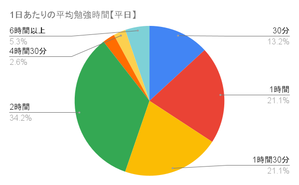 勉強時間で最も多かった回答は、平日が2時間の34.2%、休日は2時間の36.8%でした。