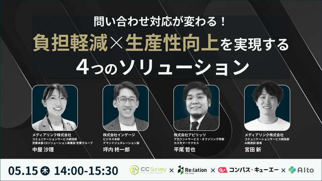 顧客対応クラウド『Re:lation(リレーション)』を開発・提供する株式会社インゲージ(本社:大阪府大阪市、代表取締役社長:和田 哲也)は、2025年5月15日(木)にオンラインセミナー「問い合わせ対応が変わる!負担軽減×生産性向上を実現する4つのソリューション」を開催いたします。