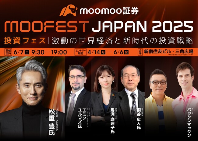 国内でアプリダウンロード数150万件(※1)を突破したmoomoo証券株式会社(ムームー、本社:東京都渋谷区、代表取締役社長:伊澤フランシスコ、以下「moomoo証券」)は、6月7日(土)に、国内初の大型投資イベント「MooFest Japan2025 ~激動の世界経済と新時代の投資戦略~」(ムーフェス・ジャパン 2025)を都内で開催いたします。