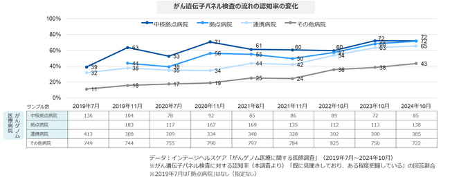 また、直近1年間で1人以上の患者に「がん遺伝子パネル検査を実施した」という医師の割合も、認知率同様に2019年から2024年にかけて増加していましたが、がんゲノム医療病院とそれ以外の施設で差が見られました。