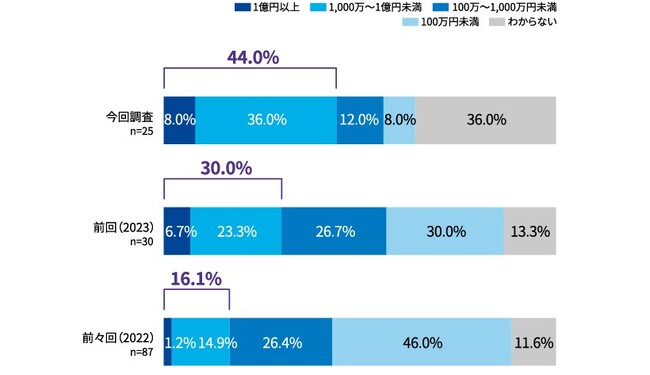 過去1年間に発生したサイバーインシデントの合計被害額が1,000万円以上と回答した企業は、前々回(2022年)調査が16.1%、前回(2023年)調査が30.0%、今回調査が44.0%と、年々被害金額が高額化していることが分かります。