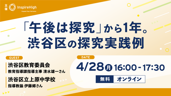 「世界とつながる探究的な学びを手軽に教室で」をコンセプトとしたEdTech教材を提供する、株式会社Inspire High(本社:東京都千代田区、代表:杉浦太一)は、渋谷区の探究事例を紹介する中高教員向けのオンラインセミナーを4/28(月)に開催します。