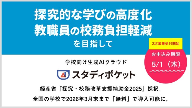 【2次募集受付開始】学校向け生成AIクラウド「スタディポケット」、経産省「探究・校務改革支援補助金2025」で全国の学校で2026年3月末まで「無料」で導入可能に。