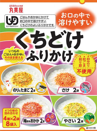 高齢者の低エネルギーを改善し、おいしく食べて QOL(クオリティ・オブ・ライフ)の向上を目指して開発した商品で、「のりとたまご」「さけ」「梅風味おかか」「やさい」の 4 商品をラインアップ。くちどけふりかけの商品特徴は、口の中で完全に溶ける、ごはんがすすむしっかりとした味付け、歯にはさまりやすい材料不使用、どこでもカットの採用、ふりかけ史上初の UDF 規格の承認を取得しているという点です。いつもの食事に彩りやバリエーションを付与でき、さらに安心してご利用いただけます。