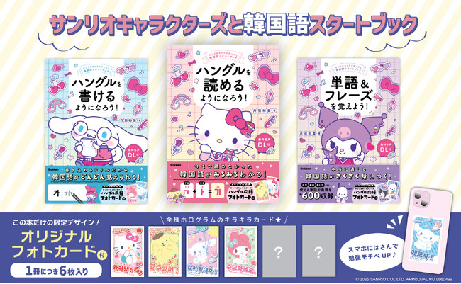 このシリーズには、1冊につき6種類の【サンリオキャラクターズ ハングル応援フォトカード】が付いています。全18種、全てホログラム仕様のキラキラカードです。[画像3: https://prcdn.freetls.fastly.net/release_image/2535/7514/2535-7514-9e751d94c0818425df8d8843255d0b56-2292x1419.jpg?width=536&quality=85%2C75&format=jpeg&auto=webp&fit=bounds&bg-color=fff ]