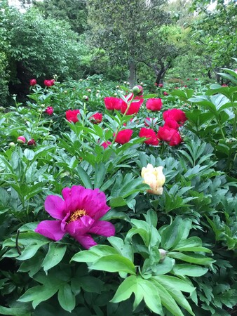 色彩が鮮明なシャクヤクとハイブリッドシャクヤクとの調和が楽しめる。