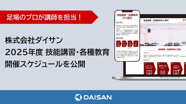 株式会社ダイサン(代表取締役社長:藤田武敏)は、2025年度の技能講習・各種教育の開催スケジュールを公開いたしました。当社パーパス「人と現場を守り抜く」の元、足場に関する豊富な知識と経験を有する足場のプロが講師を務め、業界の安全水準向上と足場に関する事故撲滅に貢献いたします。(2025年3月時点 38社5,300名以上実施)