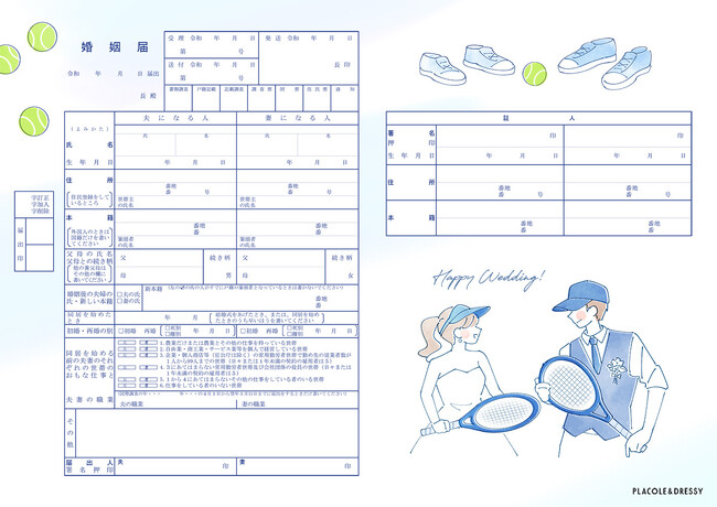 テニスラケットを手にしたふたりが描かれた、爽やかで軽やかなデザインの婚姻届です。息の合ったラリーのように、喜びも困難も共に打ち返しながら歩んでいく──そんなふたりの未来をイメージしています。