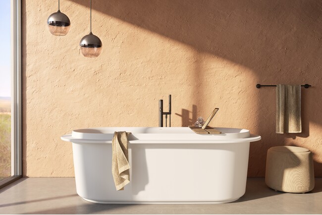 バスタブには、シリーズの洗面ボウルにも採用されている、滑らかでマットな質感のミネラルキャスト素材「DuroCast(R)(デュロキャスト)」を使用。エレガントな仕上がりがシリーズに統一感をもたらし、洗練されたバスルームデザインを完成させます。