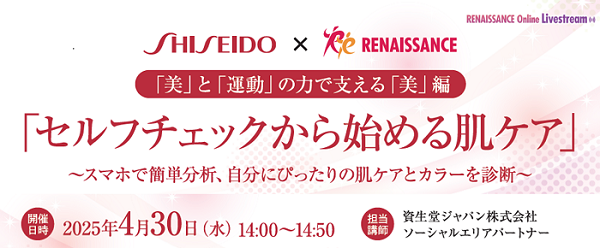 株式会社ルネサンス(本社:東京都墨田区、代表取締役社長執行役員:望月 美佐緒、以下「当社」)は、当社が取り組む「がん患者のQOL(クオリティー・オブ・ライフ=生活の質)を高めるためのがん患者支援」の一環として、資生堂ジャパン株式会社(以下「資生堂」)が実施する「資生堂ライフクオリティー ビューティー活動」と連携し、4月30日に治療の副作用による肌悩みや肌色の変化に応じたメイクに関する「セルフチェックから始める肌ケア」セミナーを共催します。