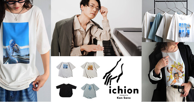 ichion第1弾アイテム9型を一斉発売。ichionのロゴTトップス以外の7アイテムは、すべてKan Sanoによるコラージュ作品がレイアウトされています。