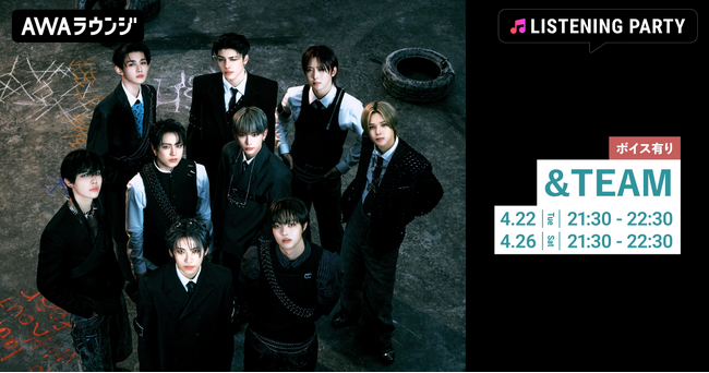 AWA株式会社(本社:東京都港区、代表取締役CEO:冨樫晃己)が運営する、サブスクリプション型(定額制)音楽ストリーミングサービス「AWA(アワ)」は、2025年4月22日(火) 21:30~22:30と4月26日(土) 21:30~22:30の2日程に渡り、無料で誰でも参加できるオンライン空間「AWAラウンジ」で、&TEAM特集のリスニングイベントを開催いたします。