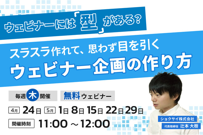 ショクサイ株式会社(代表取締役:辻本 大樹)は4月24日(木)11時よりBtoBマーケティング担当者向けに「ウェビナーには型がある?スラスラ作れて、思わず参加したくなるウェビナー企画の作り方」を開催いたします。