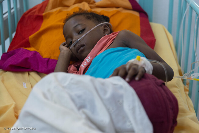 ポルトープランスにある病院で、治療を受けている6歳の女の子(ハイチ、2025年1月28日撮影) (C) UNICEF/UNI738676/Erol