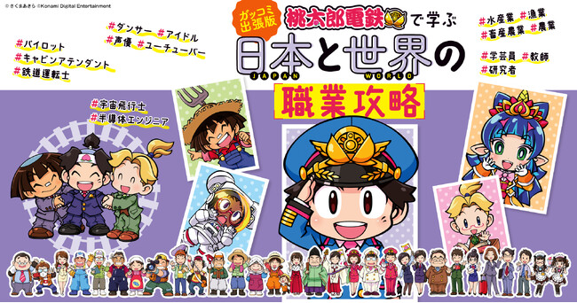 キャビンアテンダント、パイロット、鉄道運転士、マンガ家……ゲーム『桃鉄』エンタメ学習本最新刊は「職業」。4コママンガは「ガッコミ」で配信中!