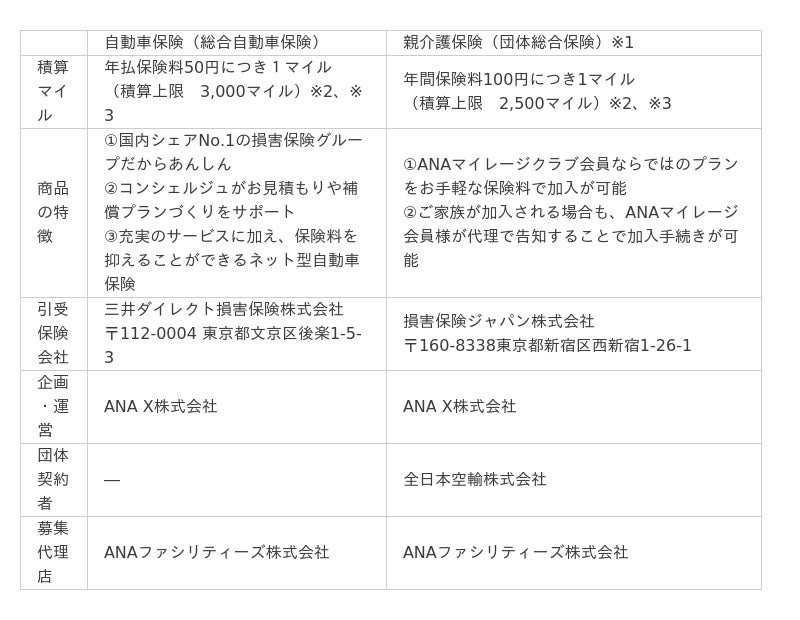 ANAの保険でマイルが貯まる商品の発売は今回が初となり、自動車保険は年払保険料50円につき1マイルを、親介護保険は年間保険料100円につき1マイルを積算いたします。