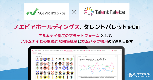 株式会社プラスアルファ・コンサルティング(本社:東京都港区、代表取締役社長:三室克哉 証券コード:4071)は、データに基づく人材活用や採用業務の効率化・高度化、人事業務のDX化、リスキリングの推進などを目的に、多くの大手企業で導入が進んでいるタレントマネジメントシステム「Talent Palette(以下:タレントパレット)」をアルムナイ制度*のプラットフォームとして株式会社ノエビアホールディングス(本社:神戸市中央区、以下:ノエビアHD)に導入いただきましたことをお知らせいたします。