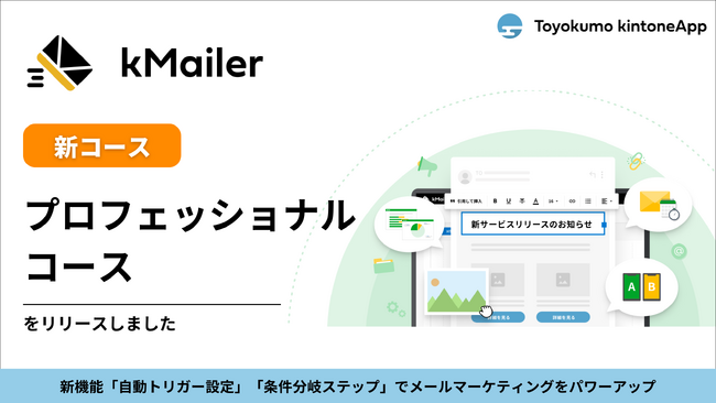 誰でも簡単に使えるビジネス向けのクラウドサービスを提供するトヨクモ株式会社(本社:東京都品川区、代表取締役社長:山本裕次、以下トヨクモ)は、この度、サイボウズ株式会社(本社:東京都中央区、社長:青野 慶久、以下サイボウズ)が提供する業務改善プラットフォームである「kintone」と連携するkMailerにおいて、メールマーケティングに活用いただける「プロフェッショナルコース」機能を提供開始したことをお知らせいたします。