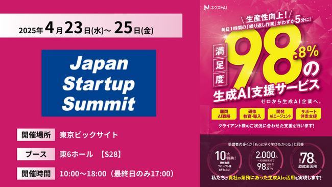 株式会社カトルセ(本社:東京中央区、代表取締役:橋本 健太郎)は、2025年4月23日(水)~25日(金)に東京ビックサイトにて開催の「Japan Startup Summit【春】」に出展します。