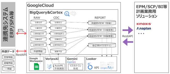 BigQuery上でCortex Framework(データ統合と分析のためのフレームワーク)を活用し、ERPやSFA(営業支援ツール)から定期的にミラーリングしたデータを高速で分析を行い、AIエージェントの基礎判断情報とします。また、気象情報や相場情報などの外部データと連携し、イベント発生の判断やリカバリー情報の予測元情報として活用します。