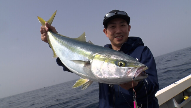 「これは青物やろ!」手応えを感じる小中。姿を見せたのはおよそ70cmのブリの若魚・メジロ。待望の青物に喜びもひとしお。