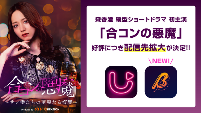 株式会社QREATION(キュリエーション)(本社:東京都渋谷区、代表取締役社長:米永 圭佑)が、KDDI株式会社(本社:東京都千代田区、代表取締役社長 CEO:松田 浩路 以下:KDDI)と共同制作した、森香澄が主人公を演じるスマホ向け縦型ショートドラマ「合コンの悪魔 ~サレ妻たちの華麗なる復讐~」が、好評につき新たにショートドラマアプリ「BUMP」にて配信を開始いたしました。